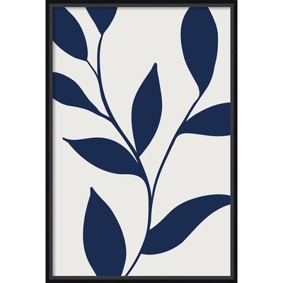 A minimalist artwork featuring a navy blue botanical silhouette of a branch with leaves against a light background. The simple, clean lines and contrasting colors create an elegant and modern design.
