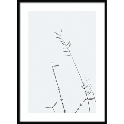 A minimalist black and white photograph featuring thin, delicate branches with sparse leaves against a light background. The composition emphasizes simplicity and tranquility, capturing the subtle beauty of nature.