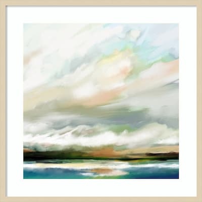 A vibrant abstract depicting a dynamic sky over a reflective body of water. The artwork features sweeping brushstrokes in shades of green, blue, white, and peach, capturing the movement and energy of clouds and their reflection on the water's surface.