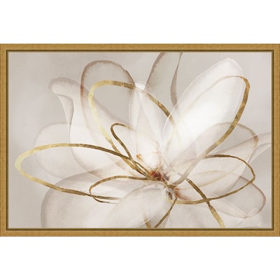 - The canvas is framed in the modern Sylvie Gold frame, featuring gold coloring, burnished detailing, and dramatic depth.