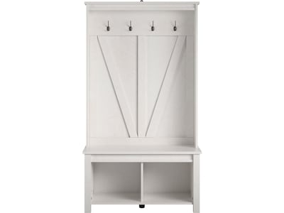 Create a warm, inviting entrance into your home with the Ameriwood Farmington entryway hall tree with storage bench. The ivory oak woodgrain laminate finish on the MDF and particleboard adds a classic feel to this piece. Have everything you need to walk out of the door in one place with the hall tree's metal hooks and two storage cubbies. Hang coats, bags, and hats on the four hooks, or organize shoes in the lower cubbies. Put your shoes on or take them off on the convenient bench. A wall anchor kit is included to secure the hall tree to the wall and prevent tipping injuries. The entryway hall tree with storage bench ships flat to your door and requires assembly upon opening. Two adults are recommended to assemble.