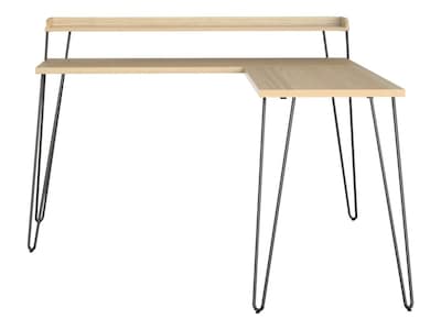 Mix industrial and modern styles together to get the Ameriwood Home Haven L-shaped desk with riser. This desk is perfect for both large and small home offices with its small footprint and offers two levels of desk space with the added riser. The L-shape makes it easy to place the desk either in the corner or middle of the room to define your space as needed. The natural woodgrain finish coordinates with almost any decor, while the laminated particleboard desktop and powder-coated metal legs give this desk a sturdy build along with a fun design. The desk top is large enough to hold your laptop, notebooks, and office essentials, while the riser can be used to keep items close by but out of your way. The metal hairpin legs are a fun throwback to popular mid-century design. The L-shaped desk with riser ships flat to your door and requires assembly upon delivery. Two adults are recommended for proper assembly. The desk can hold up to 80 lbs.