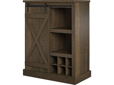 Add a rustic touch to your next party with the Ameriwood Knox County bar cabinet. MDF and particleboard in a brown oak wood-grain finish pair with the sliding barn door to add a trendy rustic feel to your space. Use as a bar cabinet, and store your wine and liquor bottles, glasses, and mixers on the four shelves and in the 12 bottle cubbies, or use as a stylish coffee bar. This multifunctional piece offers plenty of storage for all of your party accessories or everything you need to make your next cup of joe. The bar cabinet ships flat to your door and requires assembly upon opening. Two adults are recommended to assemble.