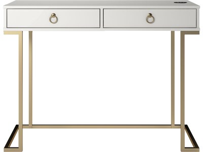 Enhance your home office like a boss with the Ameriwood Serenity computer desk. The white finish on the laminated MDF and particleboard pairs well with the gold powder-coated metal legs for a fun and unique look. The gold ring drawer pulls adds a sophisticated touch. Complete with a wireless charging spot, the desktop allows you to charge your phone without the hassle of cords. The two drawers offer ample storage space for all of your pens, pencils, and stationery. The writing desk ships flat to your door and requires assembly upon delivery. Two adults are recommended to assemble.