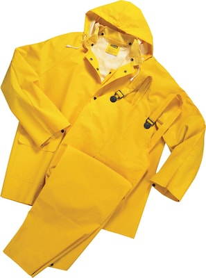 Anchor Brand® 3X Rainsuit in yellow color has two front pockets with flaps for storage of items and drawstring hood for user convenience. Rainsuit with front closure as well as a vented cape back is made of PVC/polyester for enhanced durability.