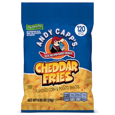 Rediscover a childhood favorite with Andy Capp's Cheddar Flavored Fries, a savory alternative to the same-old snacks. Spice up snack time with a crunchy, cheesy, delicious kick of Andy Capp's signature flavors. Andy Capp's Cheddar Flavored Fries look like fries and crunch like chips, bringing out the kid in all of us. Satisfy your taste buds with the Fries' rich burst of cheddar awesomeness. From road trips to lazy afternoons on the couch, Andy Capp's punches up every snack-worthy activity. Each bag contains 0.85 oz with 120 calories per serving and 0 grams trans fat. Includes 72 bags. Andy Capp's has been providing a unique and delicious alternative to potato chips for more than 40 years.