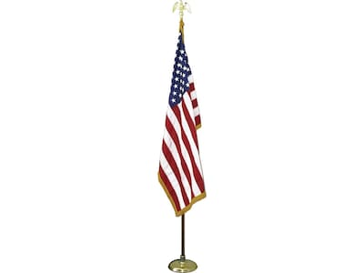Display this U.S. flag on stage beside state and institution banners to welcome dignitaries and other officials. A durable oak staff, a sturdy round base, and a golden eagle topper provide everything you need for immediate use, and the generous dimensions let the flag stand out. This Advantus indoor U.S. flag and staff set can be removed from its base for use in color guard presentations.