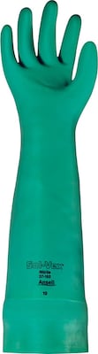 Ansell® Sol-Vex® Large 18" long unsupported nitrile gloves in green color feature straight cuff and are chemical resistant. High-performance gloves can be used with aromatic or petroleum solvents and are ideal for industrial or warehouse works.