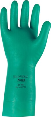 Ansell® Sol-Vex® Large 13" long unsupported nitrile gloves in green color feature straight cuff and are chemical resistant. Gloves with 11 mil thickness can be used with aromatic or petroleum solvents and are ideal for industrial or warehouse works.