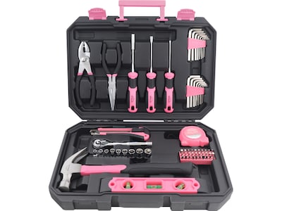 This Apollo Tools compact tool set in an attractive pink color is designed to satisfy high standards and will find its place at home for everyday repairs. The kit offers an essential selection of tools with quick access to a claw hammer, level, 16' tape measure, screwdriver set (Phillips and slotted), two essential pliers (slip-joint and long-nose) with double-dipped handles for grip comfort, box cutter, 72-tooth ratchet handle, nine-piece socket set, two sets of hex keys (metric and SAE), and an extensive selection of bits, so you'll always have the correct bit for the task at hand. This is an easy-to-carry, easy-to-store basic tool set you will love for tasks big and small at home, the office, and in the garage.
