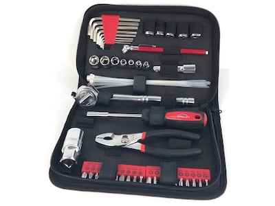 This Apollo Tools auto tool set is small, compact, fits anywhere, but contains the essential tools for your vehicles' emergency repair, including the most frequently used 1/4" and 3/8" sockets, hex keys, tire gauge, slip joint pliers, cable ties, and a bit driver with its 20 most frequently used bits. The tools hold in place with elastic straps, making them easy to store and easy to find. The case is small enough to fit in a larger glove compartment, a backpack, a motorcycle saddlebag, or even stay at home in a kitchen drawer for quick access.