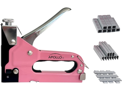 Apollo Tools's pink heavy-duty three-in-one construction stapler is great for easy stapling of rectangular and rounded staples and manual nailing of brad nails. Includes an assortment of 3000 staples. Perfect for crafts, upholstery, and DIY maintenance and repairs. There is no end to the usefulness of a good stapler for DIY projects at home, in the garage, in the garden, or at the office. Upholster furniture, install carpet padding, build a garden trellis, install holiday lights, or complete a school project. This stapler accommodates three types of staples: rectangular, rounded (U-shaped), and brad-type nails. No matter what you're working on, you always have the right tool for the current project. Every part of this stapler is made of metal, no plastic included. This heavy-duty stapler has the power of a staple gun and yet is as easy to use as a stapler.
