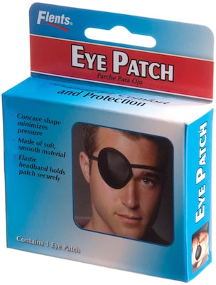 Eye patch has concave shape minimizes pressure, soft, smooth material, elastic headband holds patch securely.
