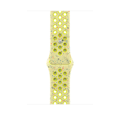 Made with compression-molded perforations for breathability, the Nike Sport Band is durable and strong, yet surprisingly soft. It features colorful flakes that create a randomized pattern, making each band completely unique. The smooth, dense material drapes elegantly across your wrist and feels comfortable next to your skin. An aluminum pin-and-tuck closure gives the pin a fresh matte finish. This band contains at least 30% recycled fluoroelastomer, with each flake containing at least 66% recycled fluoroelastomer.