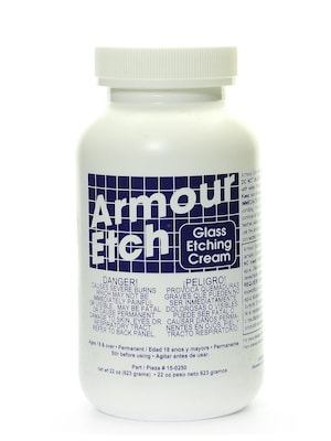 Armour Etch is a fast acting specially formulated glass etching compound that lets you create permanent etched designs on windows, mirrors and household glassware. Create your own custom glass etching stencil or use pre-cut stencils. This unique glass e tching system enables anyone to personalize and decorate glass or mirrors in minutes with no previous experience. Not intended for use by children. Will not etch plastics or some Pyrex.