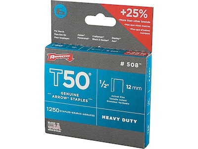 Complete heavy-duty stapling tasks with these Arrow T50-type staples. The 1/2-inch thickness works on a wide variety of materials, including foam, padding, carpeting and batting, while the durable construction ensures a secure fasten. These staples are designed and manufactured in the United States, and they are compatible with Arrow T50 staple guns as well as other select models. Bundled in convenient strips, these Arrow T50-type staples are easy to load whenever you have a tough project to tackle.