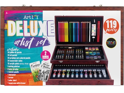The 119-piece Art 101 Deluxe all-media wood art set helps artists learn and grow with the self-expression of art. Want to experiment with a number of different art mediums" This all-in-one wood case includes everything you need to inspire artistic greatness. If you've ever wanted to explore acrylic painting, this set provides you with 12 acrylic paint tubes to create your next masterpiece. Choose from a variety of colors, and mix colors to create new hues, tones, and shades. 24 watercolor cakes are also included, along with two paint brushes, three paint palettes, and a color-mixing chart, giving you an array of painting tools to get started.