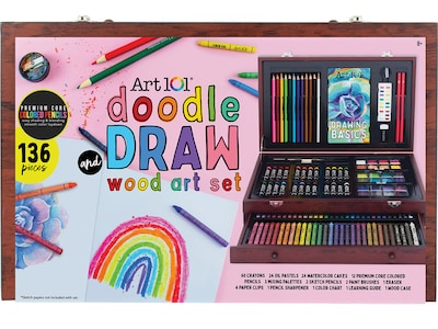 The Art 101 doodle and draw 136-piece multimedia wood art set includes all the tools needed to expand your creativity and design your next colorful masterpiece. Includes 12 colorful premium core-colored pencils, which are perfect for the beginner and advanced artist alike. The pencils lay down smooth and pigmented on your paper. Build up the color and opacity by varying the pressure on your pencil, and blend different colors together to create different shading effects. There's something for everyone in this 136-piece art set, which also comes with 24 oil pastels and 60 colorful crayons.