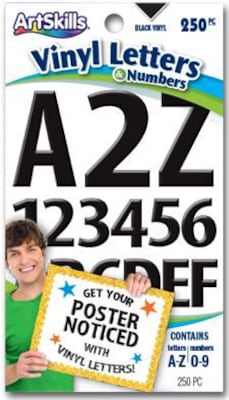 The ArtSkills® black vinyl letters and numbers are great for signs, presentations, arts and crafts and science fair projects. This weatherproof letters and numbers are self-sticking and repositionable, sold as 250 characters per pack.