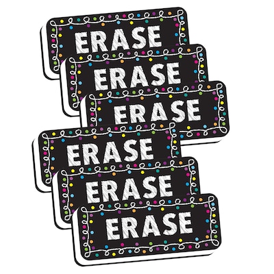 Fun and colorful design to brighten up your magnetic whiteboard. Easy to grip and hold for adults and children. Use with dry erase markers. Eraser is made from a durable foam with a black felt erasing surface. Built in magnet helps to easily stick to magnetic whiteboards and other magnetic surfaces. Measures 2" x 5". Sold as a pack of 6 erasers.