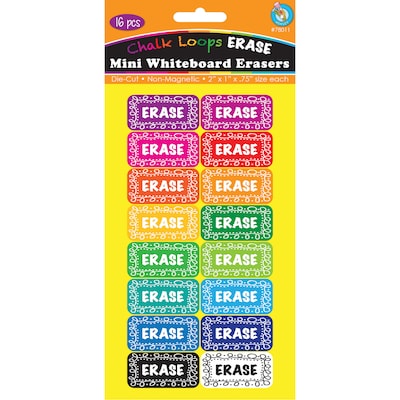 Fun and colorful design to brighten up your magnetic whiteboard. Easy to grip and hold for adults and children. Use with dry erase markers. Eraser is made from a durable foam with a black felt erasing surface. Makes a great incentive item. Each pack includes 16 erasers.