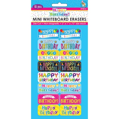 Ashley Productions Mini Whiteboard Erasers, Happy Birthday, 2" x 1" x 0.75", Pack of 16 (ASH78016)