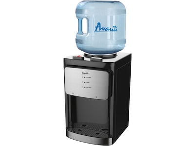 This thermoelectric Avanti water cooler is compact and lightweight. Tabletop thermoelectric hot and cold water cooler fits just about anywhere in the home or office. This portable water dispenser features push button faucets for hot and cold drinking water with LED indicator lights for all functions. A thermoelectric system provides quiet, energy-efficient cooling.