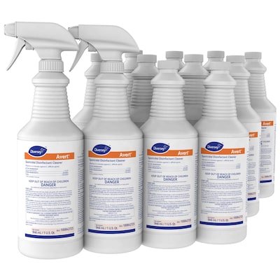 Keep the workplace germ-free with this fragrance-free bleach-based formula. It effectively kills Clostridium difficile (C. diff) spores in 4 minutes and works on hard, nonporous surfaces in bathrooms and various medical facilities. This 12-count of 32-ounce Diversey Avert disinfectant bottles is easy to apply with dry cloth, sponge, or paper towel and does not require rinsing.