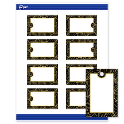 Add an elevated, professional touch to your branding or event with Avery Rectangle 2" x 3" Matte White Printable Tags featuring the Black Border with Gold Veins design. These premium tags are pre-printed with elegant, metallic gold accents that standard desktop printers simply can't replicate, giving your business or event an instant upgrade. With a design already pre-printed, you can easily customize the blank space while using less ink—just personalize and print. For a cohesive look, pair these printable tags with other Avery products in the same design collection. Made with sturdy 80 lbs / 216 gsm cardstock and micro-perforated edges, these customizable tags feature a pre-printed design on one side and can be personalized on both sides for full customization. The smooth matte white finish delivers clean, versatile results that work beautifully across a wide range of projects. Compatible with laser and inkjet printers, these tags make it easy to print personalized printable tags with professional results. Built-in Sure Feed technology is designed to provide a more reliable feed through your printer, helping to reduce misalignments, printer jams, and wasted product. Search Avery Presta Template S00-ETQ, and use Avery Design & Print to add your own logo, text, and artwork. Our easy-to-use design software lets you add your own personal touch while enjoying the consistency of the stunning, pre-printed design.