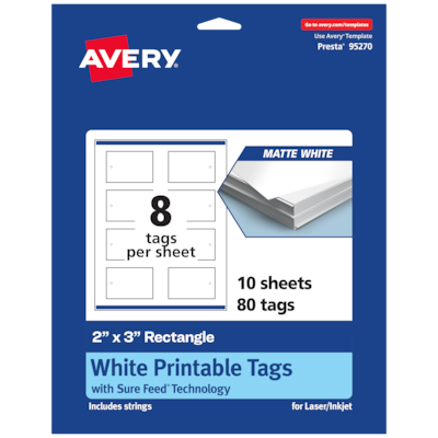 Easily create your own favor tags, thank you tags, pricing tags, branding tags, ingredient tags, care instruction tags, and more with Avery Matte White Rectangle Tags. Personalize your own tags for gifts, products, favors, and more. Strings are included so that you can easily attach the tags but the pre-punched holes also work great with ribbons and twine. Created with heavyweight and durable 80lb / 216 gsm cardstock, the smooth matte material is a versatile fit for any project or event. Printable on both sides and compatible with laser and inkjet printers, the matte white tags let you create professional designs with a desktop printer. Avery tags are carefully constructed with patented features to provide the best results.