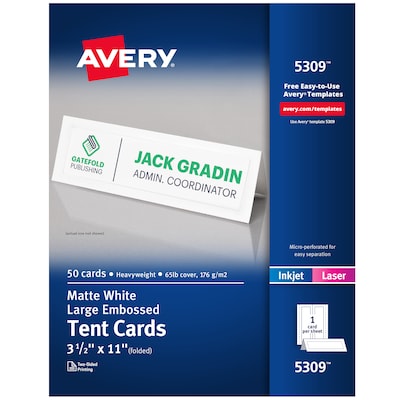 Each Avery embossed large tent card comes with perforations and pre-scoring to make preparing them easier. Just separate and fold along the designated lines to set up the cards quickly and without hassle.