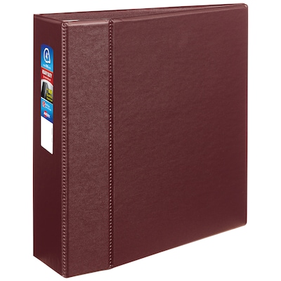Designed to last, Avery 79364 Heavy-Duty Maroon 4 Inch Binders are perfect for long-term storage and everyday use. Created with durable, non-stick polypropylene, Avery Heavy-Duty Binders are built to defend your documents from everyday wear and tear. Our DuraHinge technology helps avoid tearing along the spine and our DuraEdge technology makes the sides more pliable to resist splitting. The wide front and back panels are great for protecting sheet protectors and divider tabs. The 4 inch rings use our EZD design that opens with ease and can keep up to 780 pages secure. EZD rings can also hold up to 50% more sheets than round rings of the same size. The binder rings are mounted on the back cover to keep your pages flat to avoid creasing and for easy flipping. Four interior pockets are included to store loose sheets and extra documents. Whether you need binders for school, a presentation binder or a trading card binder, organize your next project with Heavy-Duty Avery Binders.
