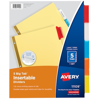 Organize and file paperwork effortlessly with these insertable dividers. The large tabs offer ample space for subject names, and the multicolored design lets you assign a hue to each category. The buff paper dividers feature gold-reinforced edges to withstand frequent page turns. These Avery Big Tab Insertable dividers come prepunched and ready to add to standard three-ring binders.