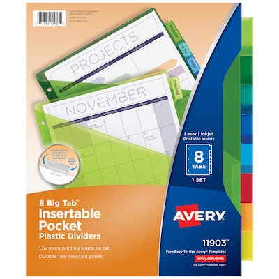 Transform your binder organization with Avery(R) 11903 Big Tab(TM) Insertable 8-Tab Dividers for 3-ring binders. The Big Tab(TM) design offers 1.5 times more writing space than standard binder divider tabs, giving you more room for larger fonts or extra details for better visibility. Ideal for work, school, or home, these binder dividers with pockets are made from sturdy, tear-resistant plastic that wipes clean with most non-abrasive household cleaners to keep your binder neat and presentable. Each divider also features two durable pockets, perfect for storing and managing loose sheets, receipts, handouts, smaller-sized papers, and more. Each durable plastic tab includes a unique indent that holds inserts securely in place, preventing them from falling out. The 3 ring binder dividers with tabs come in vibrant multicolor Neon Brights for quick referencing and easy color-coding. Use Avery(R) Design & Print Online, our easy-to-use design software, to personalize and print inserts for a polished, professional look, or handwrite directly on the tab inserts for quick customization. Whether you're organizing finances, planning events, or tracking assignments, Avery(R) binder dividers make it easy to stay on top of your tasks. This item comes with one set, for a total of 8 Avery insertable dividers with pockets.