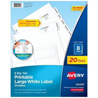 Create personalized organization that looks as good as it functions with Avery(R) 14441 Big Tab(TM) Printable Large White Label Dividers. Featuring modern arched tabs, these 8-tab dividers for 3 ring binders offer 1.5x more writing space than standard tabs with the Big Tab(TM) design—so section titles are easier to read and quick to reference. The larger tab labels extend onto the divider body, giving you even more room to include text, graphics, or logos. Customize easily using Avery(R) Design & Print Online and the available Avery(R) templates and design tools. With Print-to-the-Edge capability, you can add bold colors and full-bleed designs that extend right to the edge for a professional finish. Print your labels in vibrant color or classic black and white on laser or inkjet printers for clean, sharp results. Our convenient Easy Peel(R) feature with Pop-up Edge(R) means you can peel and apply labels with ease. Just bend the sheet back, peel, and apply—no tab inserts required. Reinforced three ring binder holes add strength and durability to your organization, keeping your dividers securely in place through frequent use. Perfect for offices, classrooms, or home organization, these durable dividers help keep your documents clearly labeled and looking their best. This item comes with 20 sets of 8-tab Avery(R) dividers.