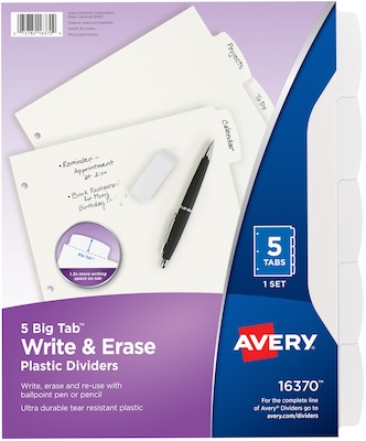 These Avery Big Tab Write & Erase Durable Plastic Dividers let you write, erase and reuse your 3 ring binder dividers, ready for easy changes at any time. Easily customize your dividers by writing directly on the stylishly shaped tabs with a ballpoint pen or pencil, and erase as needed. You can also take quick notes on the 8.5" x 11" plastic divider body and easily erase later. Made from ultra-durable, tear-resistant plastic, these tabbed dividers can be wiped clean with most non-abrasive household cleaners and are ideal for frequent use in any standard 3 ring binder. Get more space labeling with the Big Tab design that offers 1.5 times more writing space than standard binder dividers with tabs, and the clean white surface lets black and colored ink really stand out. Ideal for your personal organization at home, work and school. This item comes with a set of 5-tab binder dividers for a total of 5 white dividers.