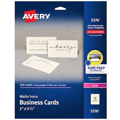Make the right first impression with Avery Business Cards. Cut from quality cardstock with a weight of 80lbs / 216gsm, these premium cards immediately feel different from everyday card sheets. Whether you need professional quality business cards, customer loyalty cards, appointment reminder cards or more, these 2" x 3.5" cards are an exceptional way to stand out from the crowd. Each 8.5" x 11" sheet of blank cards features exclusive Avery Sure Feed technology to improve print alignment and avoid jamming in your laser printer. The border of each business card is meticulously cut with a series of incisions that make it easy to tear the cards apart while still leaving behind a smooth edge. Whether you have your own design or you're creating one from scratch, Avery Design & Print makes it easy to create and print double-sided customized cards from your own home or business. The free browser-based software has everything you need to design business thank you cards, reward cards, RSVP cards for weddings and more. Try it out today on the Avery website. Please Note: These cards are optimized for use with laser printers and are not recommended for use with inkjet printers. Printing these sheets with an inkjet printer may cause smearing.