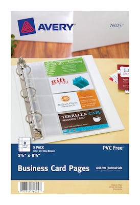 Avery Business card page is compatible for use with 3 or 7 ring 5 1/2" x 8 1/2" binder and each page can hold 8 business cards. Page is made of polypropylene material that offers better durability and can hold 2" x 3 1/2" business cards.