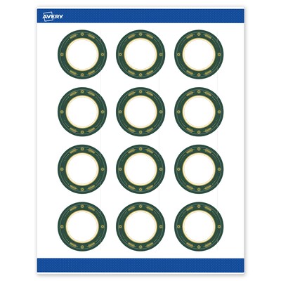 Create a lasting impression with easily customizable Avery(R) Labels that feature a stunning, pre-printed design. Add festive fun to branding and events with Avery(R) 2" Diameter Round Holiday Labels featuring the Green Border with Gold Scalloped Frame design. Elevate your business or event with these premium, printable labels that feature a pre-printed border with elegant metallic accents, delivering a look no standard desktop printer can match. With a design already pre-printed, you can easily customize the blank space while using less ink—just personalize and print. For a cohesive look, pair these holiday labels with other Avery(R) products in the same design collection. Featuring convenient Pop-Up Edge technology for faster peeling, these permanent customizable labels apply smoothly and stay securely in place. The smooth matte white finish delivers clean, versatile results that work beautifully across a wide range of projects. Built-in Sure Feed(R) technology helps reduce misalignments and printer jams by creating a more reliable feed through your printer. Compatible with laser and inkjet printers, you can easily print holiday gift stickers, holiday product labels, Christmas tag stickers, and more with professional results. Just use Avery(R) Design & Print and search Avery Presta(R) Template S00-FDQ to add your own logo, text, and artwork for a personal touch. Our easy-to-use design software lets you add your own personal touch while enjoying the consistency of the stunning, pre-printed design.