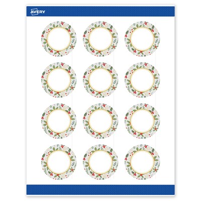 Add festive fun to branding and events with Avery(R) 2" Diameter Round Holiday Labels featuring the Light Blue Border with Gold Scalloped Frame and Holly Berries design. Elevate your business or event with these premium, printable labels that feature a pre-printed border with elegant metallic accents, delivering a look no standard desktop printer can match. With a design already pre-printed, you can easily customize the blank space while using less ink—just personalize and print. For a cohesive look, pair these holiday labels with other Avery(R) products in the same design collection. Featuring convenient Pop-Up Edge technology for faster peeling, these permanent customizable labels apply smoothly and stay securely in place. The smooth matte white finish delivers clean, versatile results that work beautifully across a wide range of projects. Built-in Sure Feed(R) technology helps reduce misalignments and printer jams by creating a more reliable feed through your printer. Compatible with laser and inkjet printers, you can easily print holiday gift stickers, holiday product labels, Christmas tag stickers, and more with professional results. Just use Avery(R) Design & Print and search Avery Presta(R) Template S00-FE8 to add your own logo, text, and artwork for a personal touch. Our easy-to-use design software lets you add your own personal touch while enjoying the consistency of the stunning, pre-printed design.
