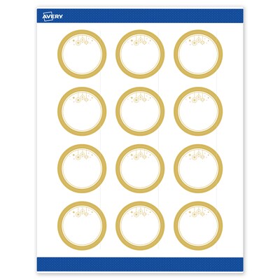 Create a lasting impression with easily customizable Avery(R) Labels that feature a stunning, pre-printed design. Add festive fun to branding and events with Avery(R) 2" Diameter Round Holiday Labels featuring the Metallic Gold Scalloped Border with Hanging Ornaments design. Elevate your business or event with these premium, printable labels that feature a pre-printed border with elegant metallic accents, delivering a look no standard desktop printer can match. With a design already pre-printed, you can easily customize the blank space while using less ink—just personalize and print. For a cohesive look, pair these holiday labels with other Avery(R) products in the same design collection. Featuring convenient Pop-Up Edge technology for faster peeling, these permanent customizable labels apply smoothly and stay securely in place. The smooth matte white finish delivers clean, versatile results that work beautifully across a wide range of projects. Built-in Sure Feed(R) technology helps reduce misalignments and printer jams by creating a more reliable feed through your printer. Compatible with laser and inkjet printers, you can easily print holiday gift stickers, holiday product labels, Christmas tag stickers, and more with professional results. Just use Avery(R) Design & Print and search Avery Presta(R) Template S00-FHD to add your own logo, text, and artwork for a personal touch. Our easy-to-use design software lets you add your own personal touch while enjoying the consistency of the stunning, pre-printed design.