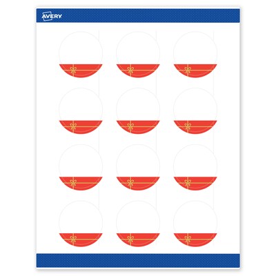 Add festive fun to branding and events with Avery(R) 2" Diameter Round Holiday Labels featuring the Red Gift with Metallic Gold Bow design. Elevate your business or event with these premium, printable labels that feature a pre-printed border with elegant metallic accents, delivering a look no standard desktop printer can match. With a design already pre-printed, you can easily customize the blank space while using less ink—just personalize and print. For a cohesive look, pair these holiday labels with other Avery(R) products in the same design collection. Featuring convenient Pop-Up Edge technology for faster peeling, these permanent customizable labels apply smoothly and stay securely in place. The smooth matte white finish delivers clean, versatile results that work beautifully across a wide range of projects. Built-in Sure Feed(R) technology helps reduce misalignments and printer jams by creating a more reliable feed through your printer. Compatible with laser and inkjet printers, you can easily print holiday gift stickers, holiday product labels, Christmas tag stickers, and more with professional results. Just use Avery(R) Design & Print and search Avery Presta(R) Template S00-FG5 to add your own logo, text, and artwork for a personal touch. Our easy-to-use design software lets you add your own personal touch while enjoying the consistency of the stunning, pre-printed design.