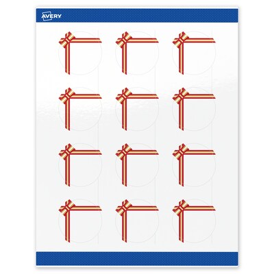 Add festive fun to branding and events with Avery(R) 2" Diameter Round Holiday Labels featuring the Red and Metallic Gold Gift Bow design. Elevate your business or event with these premium, printable labels that feature a pre-printed border with elegant metallic accents, delivering a look no standard desktop printer can match. With a design already pre-printed, you can easily customize the blank space while using less ink—just personalize and print. For a cohesive look, pair these holiday labels with other Avery(R) products in the same design collection. Featuring convenient Pop-Up Edge technology for faster peeling, these permanent customizable labels apply smoothly and stay securely in place. The glossy white finish reflects light for vivid color and detail, creating a premium, polished appearance. Built-in Sure Feed(R) technology helps reduce misalignments and printer jams by creating a more reliable feed through your printer. Compatible with laser and inkjet printers, you can easily print holiday gift stickers, holiday product labels, Christmas tag stickers, and more with professional results. Just use Avery(R) Design & Print and search Avery Presta(R) Template S00-FFN to add your own logo, text, and artwork for a personal touch. Our easy-to-use design software lets you add your own personal touch while enjoying the consistency of the stunning, pre-printed design.
