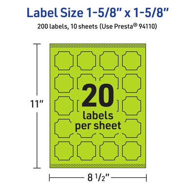 Design your own high-visibility labels with vibrant, bright colors with Avery Bright Green Square Scalloped 1-5/8" x 1-5/8" Labels. Created with brilliantly eye-catching bright green label material, these vivid labels will immediately grab people's attention so that you can easily make your own soap labels, canning labels, ingredient labels, mason jar labels, and more! The bright color is perfect whether you need to create warnings, organize inventory, or make sure your product labels stand out on a shelf. Colored labels also help you reduce printing costs by printing with black ink instead of printing color ink on white paper. Compatible with both laser and inkjet printers, these labels make it easy to design professional labels with your own home or office printer. The print-to-the-edge layout allows you to create full-bleed artwork that allows the bright label color to peek through gaps in your design and it also lets you add in borders that fill the edges without any empty spaces. Easily customize candle labels, product labels, packaging labels, and more with your own logos, art, symbols, and messaging by using the templates and designs in Avery Design & Print on the Avery site.