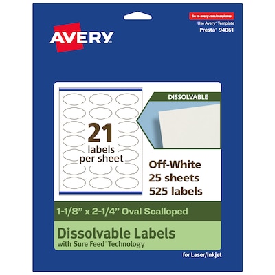 Add a personal touch to product labels, mason jar labels, container labels, and more with Avery Dissolvable Matte White 1-1/8" x 2-1/4" Oval Scalloped Labels. Designed for easy cleanup, these printable labels dissolve completely in 30 seconds without leaving behind any sticky residue, making them perfect for reusable containers. Whether you're labeling products, food storage, or meal prep, these labels are freezer-, refrigerator-, and microwave-safe, ensuring they stay in place until you’re ready to wash them away. With an FDA-compliant adhesive for indirect food contact, these sticker labels are a safe, eco-friendly solution for food container labels, beverage labels, bottle labels, and more. They help reduce waste by making it easier to reuse containers while also supporting recycling since they dissolve without adhesive buildup. Sure Feed technology reduces jams or smudges by creating a more reliable feed through your printer. The print-to-the-edge layout lets you print beautiful, full-bleed designs that fill each blank sticker to the edge. Compatible with laser and inkjet printers, these printable labels allow you to create custom labels for home, business, or food service needs. Choose a smarter, more sustainable way to label with these dissolvable Avery labels that keep your kitchen, business, and storage organized without the mess.