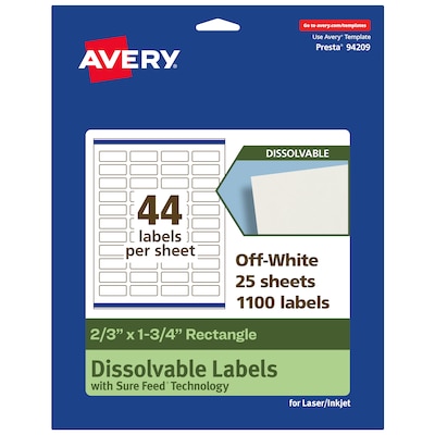 Order Avery Dissolvable Rectangle Multipurpose Labels, 2/3" x 1-3/4", Off-white, 1100/Pack (94209) today at Quill.com and get fast shipping. Stack coupons to get free gifts & extra discounts!