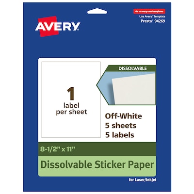 Order Avery Dissolvable Rectangle Multipurpose Labels, 8.5" x 11", Off-white, 5/Pack (94269) today at Quill.com and get fast shipping. Stack coupons to get free gifts & extra discounts!
