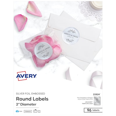 Avery Easy Peel Inkjet Embossed Foil Round Labels, 2" Dia, Silver, 96 Labels/Pack (22824)