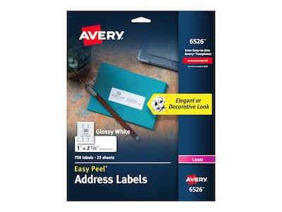 Avery Easy Peel Laser Address Labels, 1" x 2 5/8", White, 30 Labels/Sheet, 25 Sheets/Pack (6526)