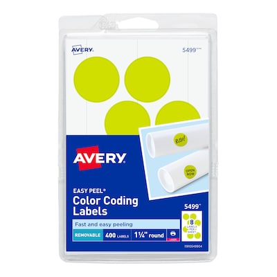 Organize files, boxes and binders by color with these Avery print-or-write neon yellow 1 1/4-inch removable color-coding labels. Make your labeling system come alive with dazzling color. These Removable Print or Write Color Coding Labels stand out on documents, mailing tubes, calendars and more when you need to call attention to your important message. Handwrite your notes or use the free templates available at avery.com to customize the labels and conveniently print them on your laser printer. The adhesive sticks firmly but allows for easy removal when no longer needed. These labels deliver color coding that paints a picture of organizational joy.